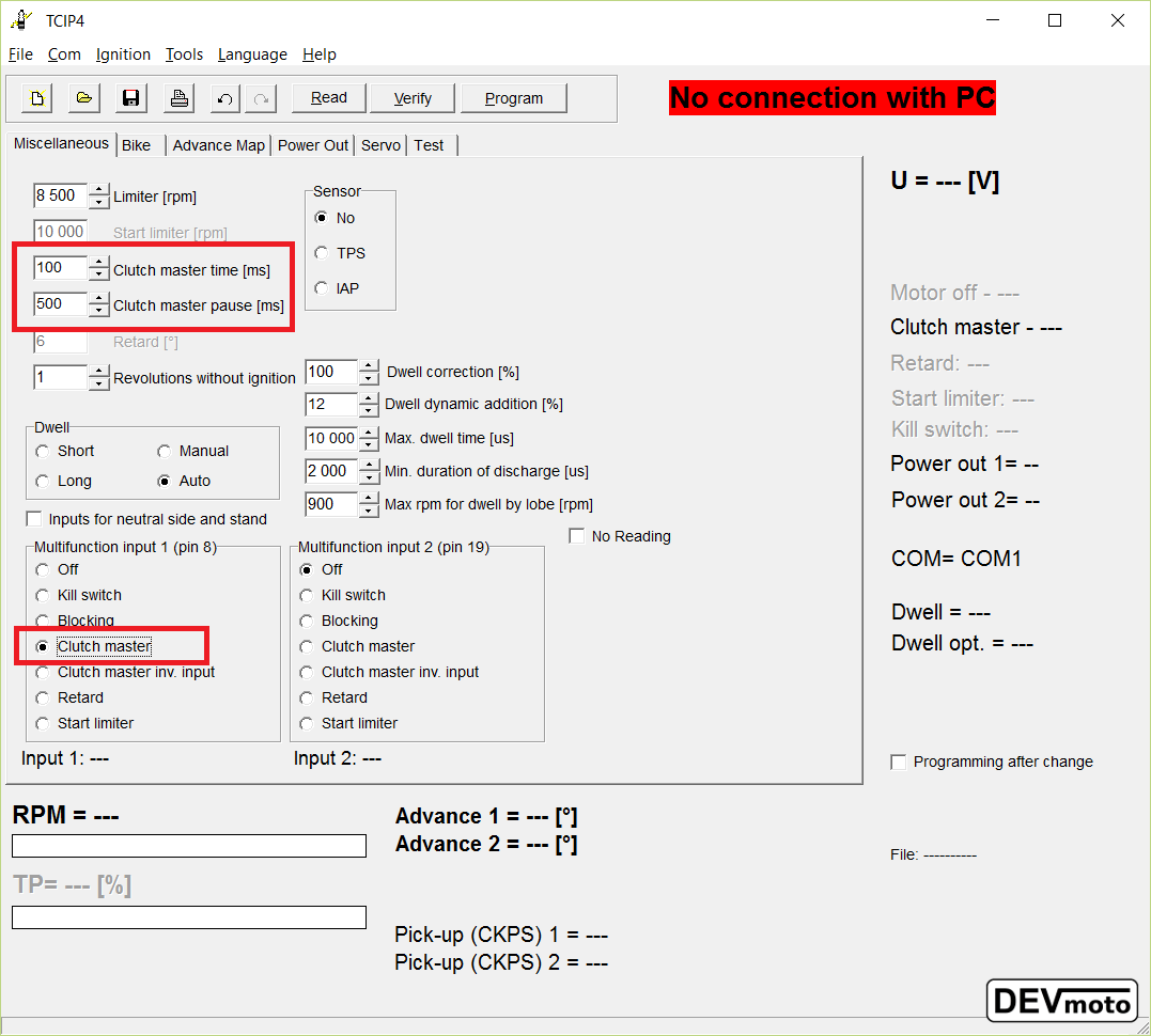 Dans l’onglet “Miscellaneous”, sélectionner “Clutch Master” dans input 1 ou Input 2 (suivant où le capteur est câblé). Puis paramétrer le temps de coupure d’allumage en millisecondes dans “Clutch master time” et le temps d’inactivité après coupure dans “Clutch master pause”.