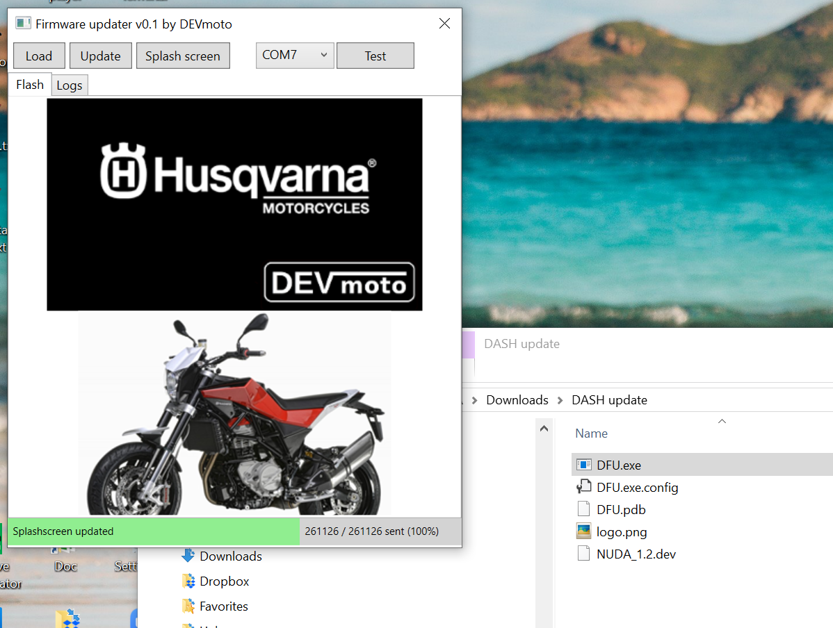 - Cliquer sur le bouton Splash screen et sélectionner votre fichier image. Votre image est affichée et le téléchargement dans le Dashboard se lance.